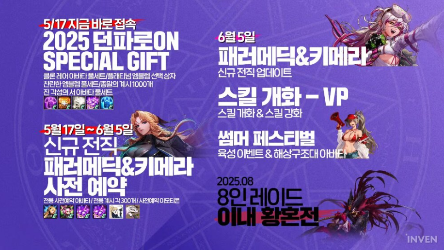안녕하세요, 곰돌이입니다. 넥슨 던전앤파이터가 2025 던파로 ON : SUMMER 온라인 쇼케이스를 개최합니다. 이번 쇼케이스를 통해 사반기 업데이트 콘텐츠를 공개한다고 하는데요. 신규 전직 2종 '패러메딕'과 '키메라', 스킬 개화 VP 시스템, 세미 레이드 이내 황혼전, 무기고와 편의성 개선안 등 이번 여름 시즌 전반의 핵심 콘텐츠를 소개합니다.