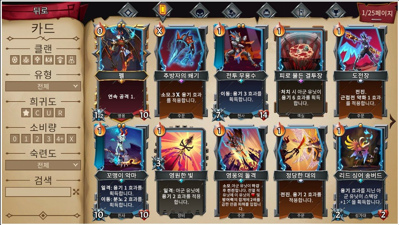 일단, 각 카드가 종류 별로 나뉩니다. 비용이 없고 무조건 한 장만 들어가는 '영웅'카드가 존재하고, 각 객실마다 효과를 주는 '객실', 직접 사용하는 '주문'이나 각 유닛들에게 장착하는 '장비' 카드도 있습니다. 유닛들은 종류에 따라 이것 저것 나뉘는데, 이 또한 각각의 효과를 지니고 있습니다. 이 중 무엇을 중심으로 덱을 구성하느냐가 스테이지 클리어로 향하는 방법이 되는 것입니다.