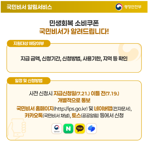 한편, 국민비서 알림서비스를 신청한 국민은 지급금액, 신청기간과 방법, 사용기한 및 지역 등 맞춤형 정보를 미리 안내받을 수 있다.