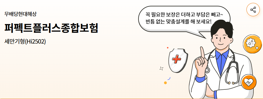 현대해상의 종합보험 상품인 퍼펙트 플러스종합보험은 사망, 후유장해, 질병 수술 입원일당 등을 최대 100세까지 보장 가능하며(해당 만기 및 특약 가입 시), 개인 특약 가입에 따라 3대질병 보장과 120대 질병 수술, 질병 수술 1-5종 보장, 표적항암약물치료, 다빈치로봇암수술, 간병 관련 보장까지 가능합니다.