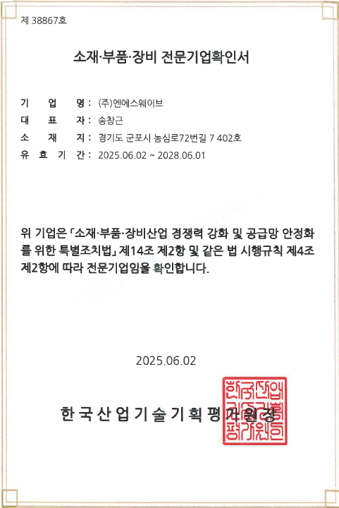 당사는 다양한 제조사업을 운영하고 있는 기업의 기술 자립도를 확인하고, 이에 준한 전문기업 확인서를 발급받은바 이가 바로 '소재.부품.장비 전문기업 확인서'입니다.