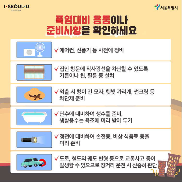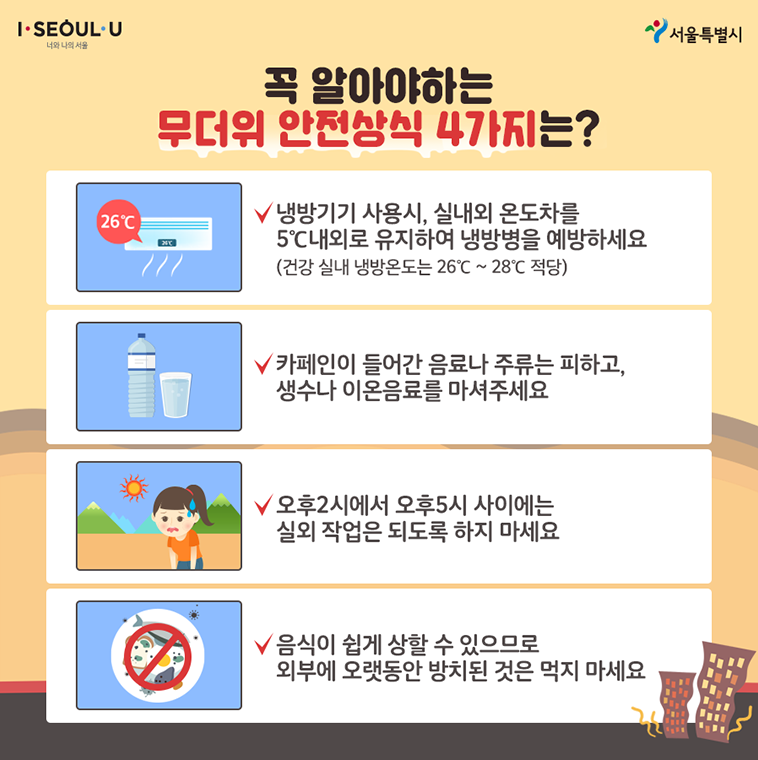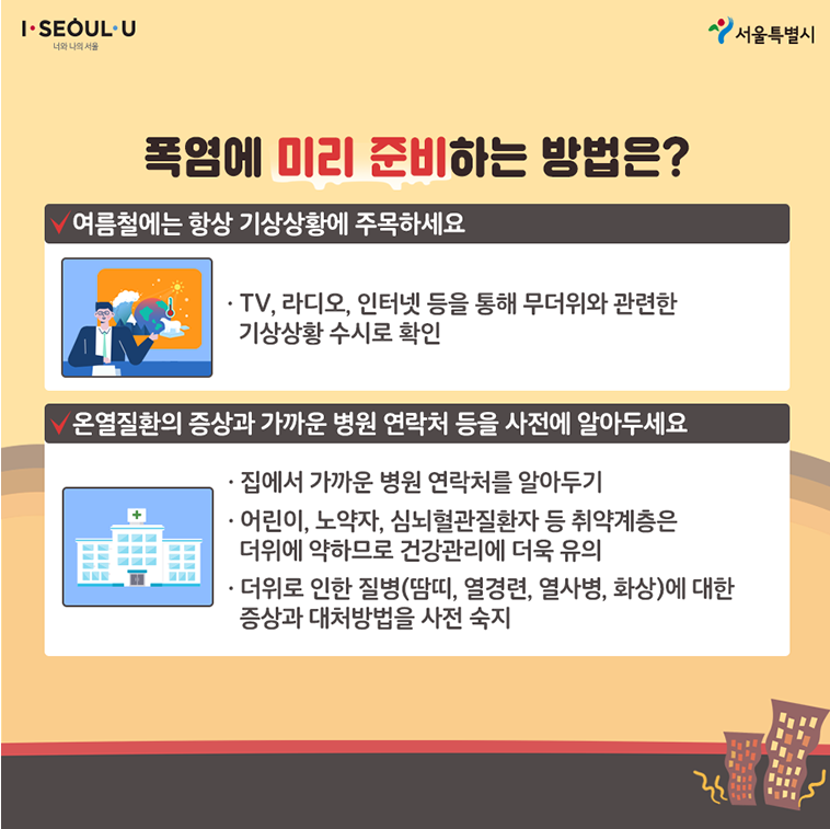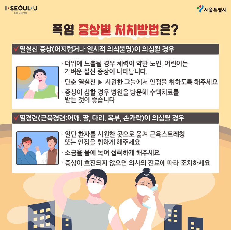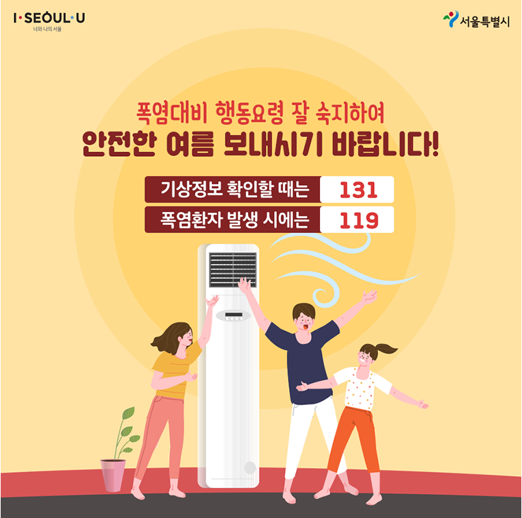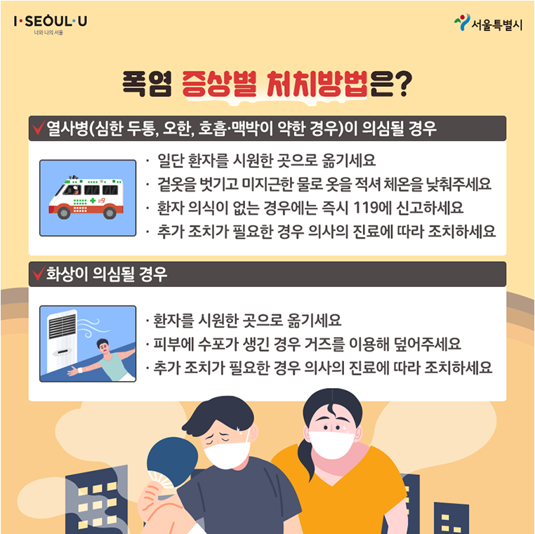 안녕하세요, 곰돌이입니다. 이번 포스팅 역시 이번 여름 폭염을 대비하는 방법에 대해서 '내 손안에 서울' 콘텐츠를 안내해드립니다. 푹푹 찌는 찜통더위의 시작.. 폭염 대비 행동요령에 대해서 숙지하세요~~~~~