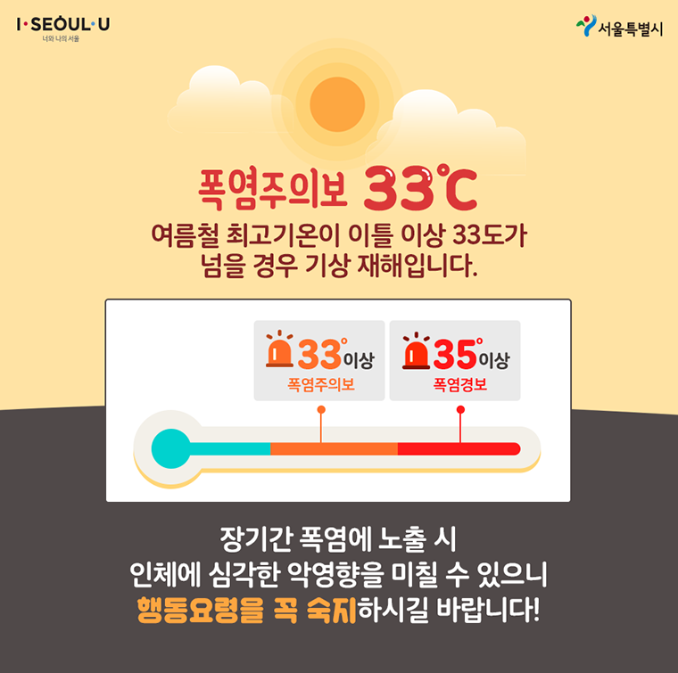 폭염주의보 33℃ 여름철 최고기온이 이틀 이상 33도가 넘을 경우 기상 재해입니다.