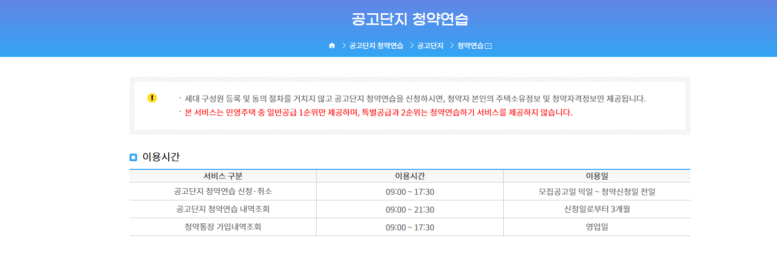 청약하고자 하는 주택을 선택합니다. 유의사항 역시 꼼꼼하게 읽어보시구요. 청약이 처음이라면 실전처럼 미리 연습해 보는것도 권해드립니다. 청약홈 '공고단지 청약연습'과 '청약 가상체험'을 활용해 보세요.
