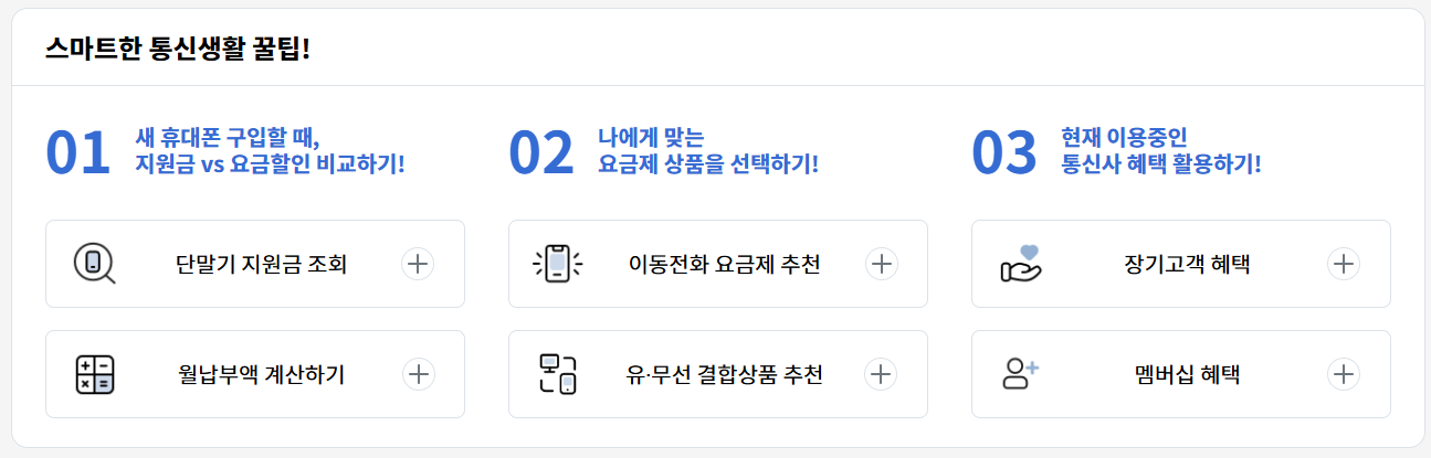 스마트 초이스 사이트는 통신요금 정보포털로 이용자들의 통신서비스와 요금제 선택권 보장을 위해 KT, SKT, LG유플러스, SK브로드밴드와 (사)한국통신사업자연합회가 공동으로 서비스를 제공하는 사이트입니다. 요금제 정보부터 통신 미환금액 조회, 최약계층 요금 감면 등 많은 알짜 정보들이 있으니 통신 요금 정보를 비교하면서 다양한 꿀팁들을 얻어갈 수 있습니다.
