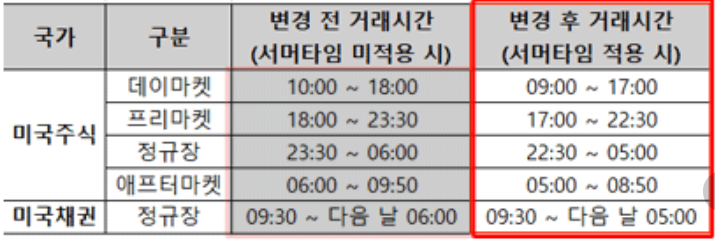 서머타임은 보통 3월 둘째 주 일요일에 시작하여 11월 첫째 주 일요일에 해재되니, 시기에 맞춰 확인하시는것이 필요합니다. 시장이 열리는 시간에 맞춰 매수/매도 주문을 계획하시면 좀 더 효율적인 투자를 하실 수 있습니다.