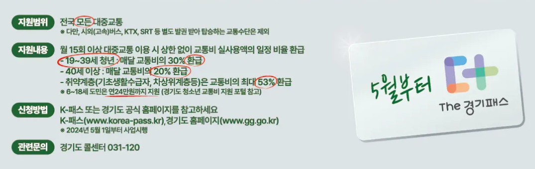청년 - 19 ~ 34세는 월별 교통비의 30% 환급(35~39세 추가 지급)